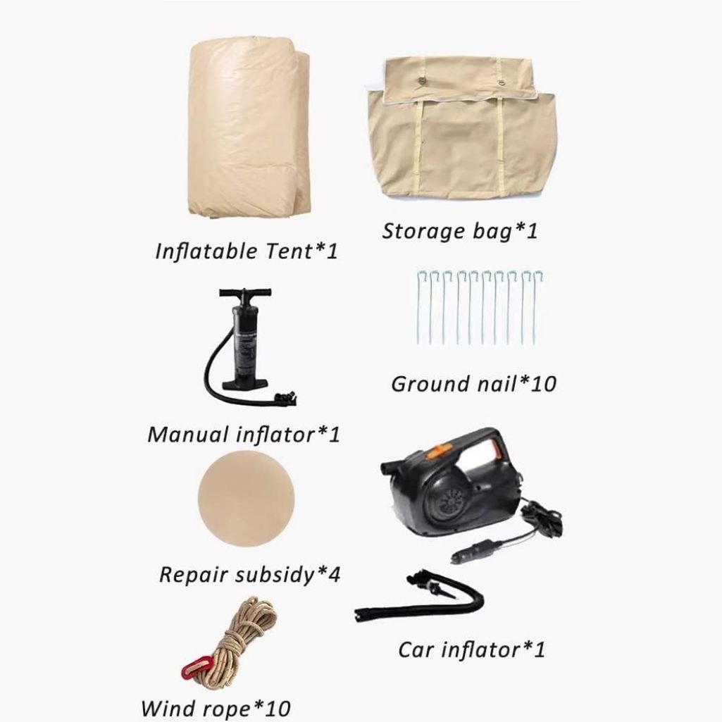 🎒 Komplettes Paket: Enthält Zelt, Aufbewahrungstasche, Stützstangen, Erdspieße, Windseil und zwei Pumpen (manuell und für Auto).